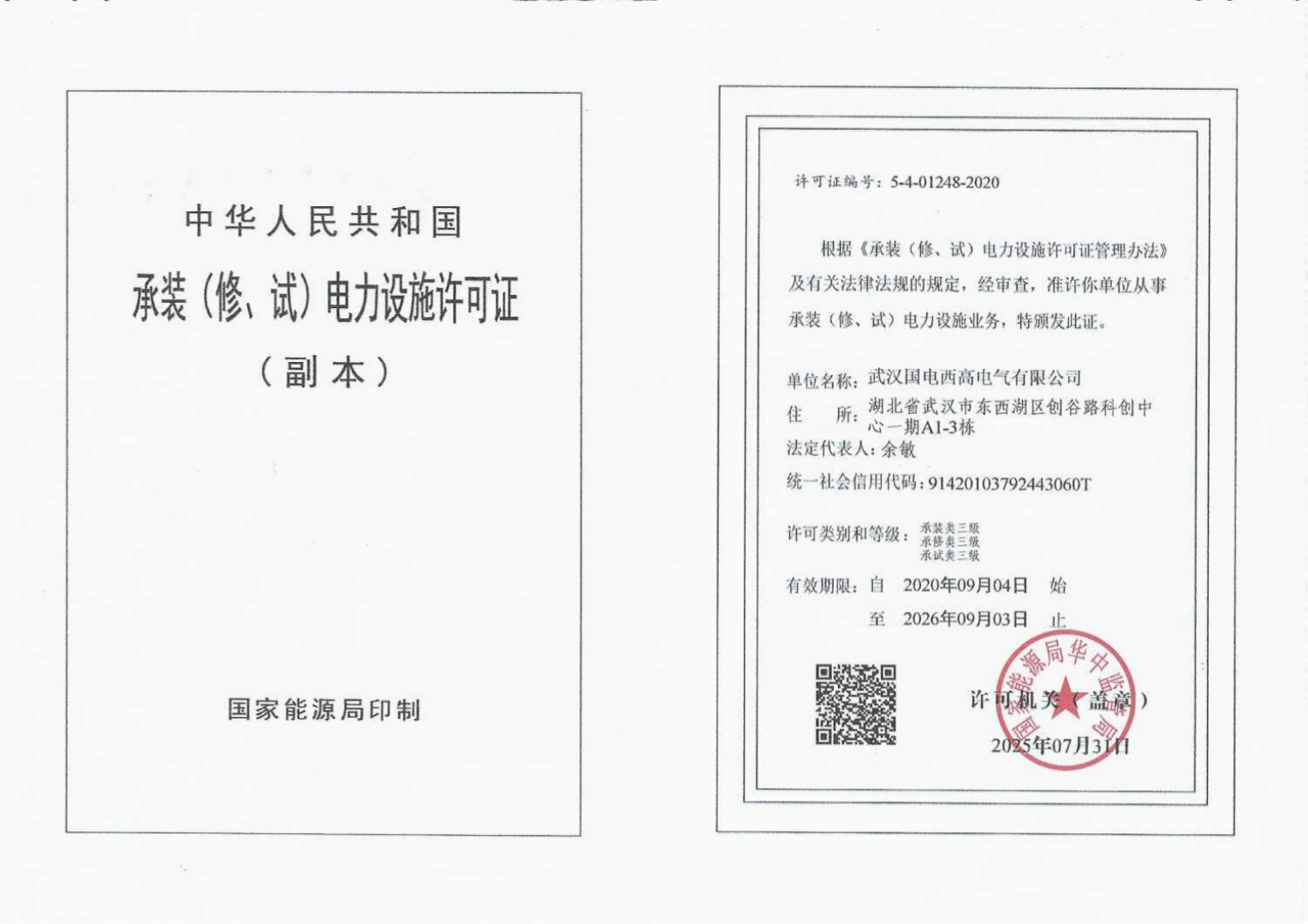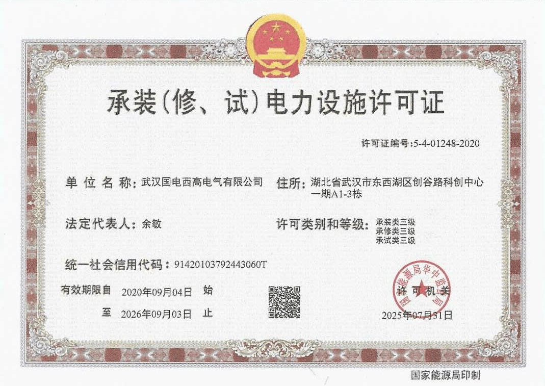• 承裝(修、試)電力設(shè)施許可證:5-4-01248-2020
