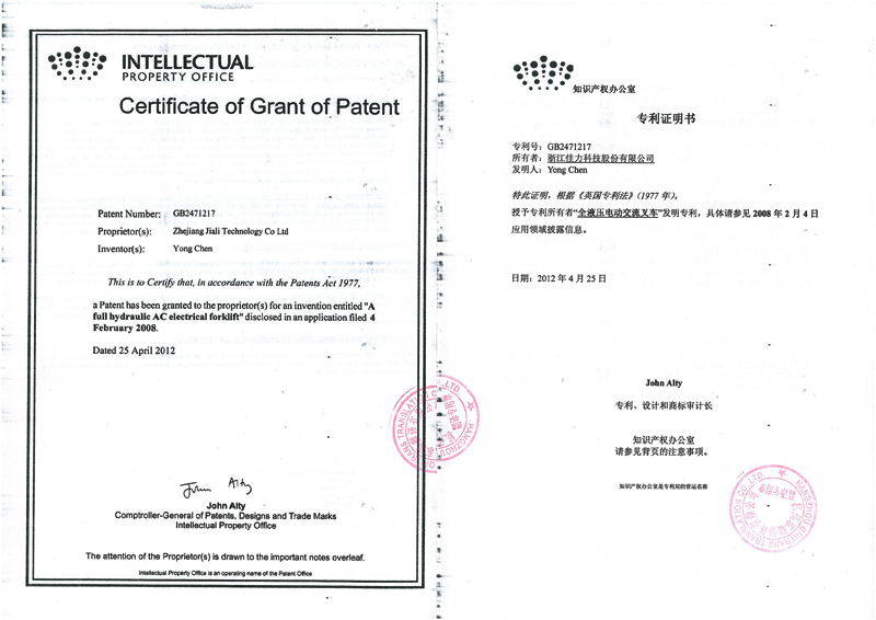 全液壓電動交流叉車獲得國際發明專利