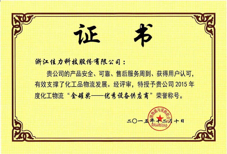 2015年12月10日-11日,由中國物流與采購聯(lián)合會(huì)?;肺锪鞣謺?huì)主辦的“2015全國化工物流行業(yè)年會(huì)”在寧波召開。圍繞行業(yè)現(xiàn)狀、趨勢及未來機(jī)遇,會(huì)議全面探討了化工物流的發(fā)展、變革與創(chuàng)新,并舉行了“2015中國化工物流金罐獎(jiǎng)”的評(píng)選。在年度企業(yè)評(píng)選中,浙江佳力科技股份有限公司作為設(shè)備供應(yīng)商榮膺“金罐獎(jiǎng)——優(yōu)秀設(shè)備供應(yīng)商”稱號(hào)。
