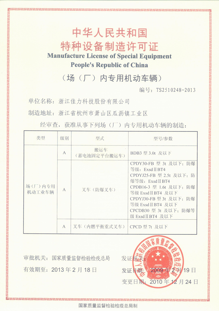 場(chǎng)(廠)內(nèi)專用機(jī)動(dòng)車輛特種設(shè)備制造許可證