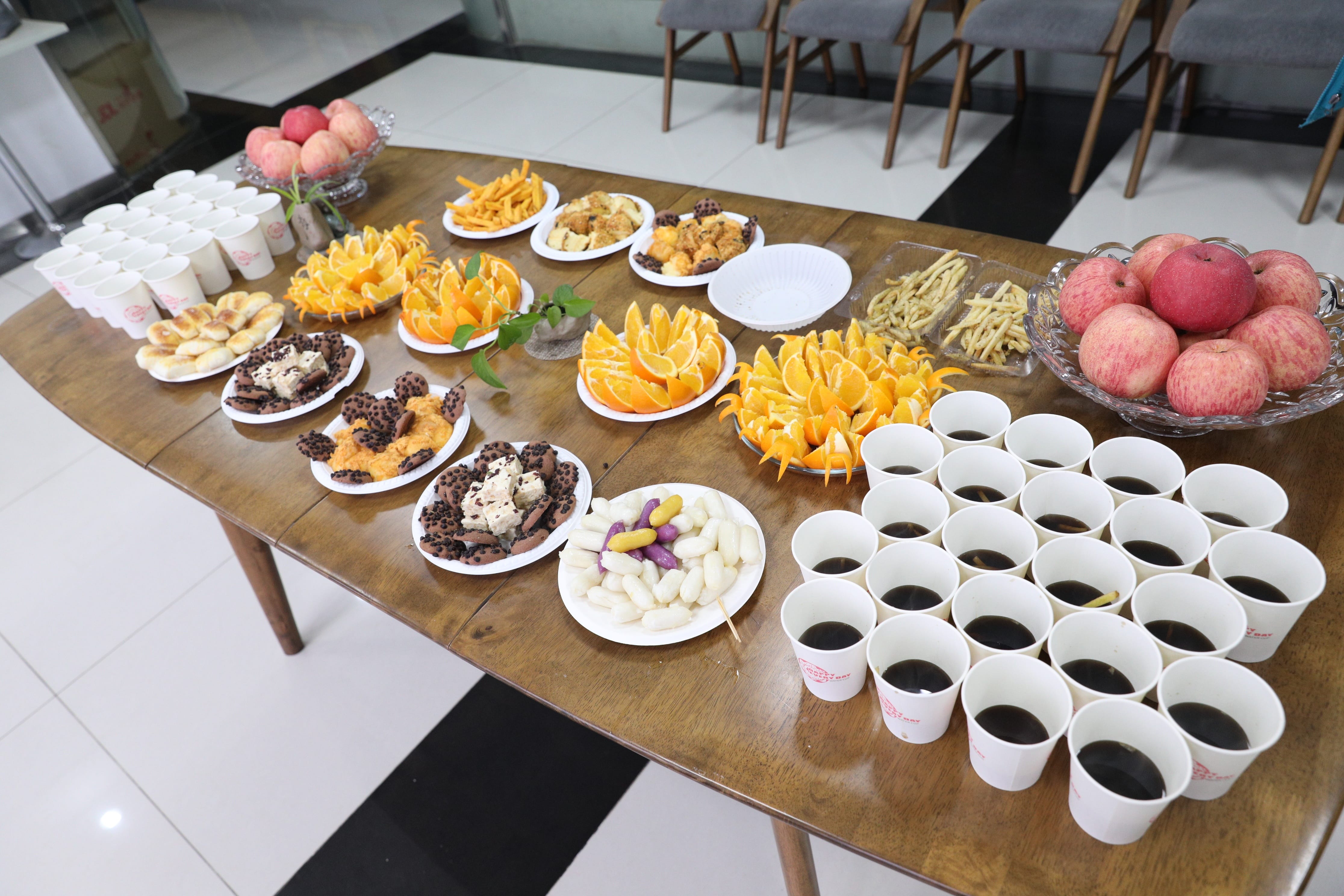 領完福利后,大家移步到餐廳一起享用雙旦特殊下午茶時間。在美味可口的水果、點心前,大家停滯不前,享受美食。