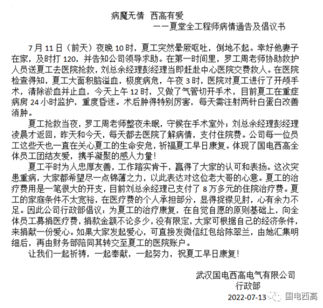因夏工病情未穩定,后續還需要費用,公司股東會在公司內部發起了募捐倡議書。