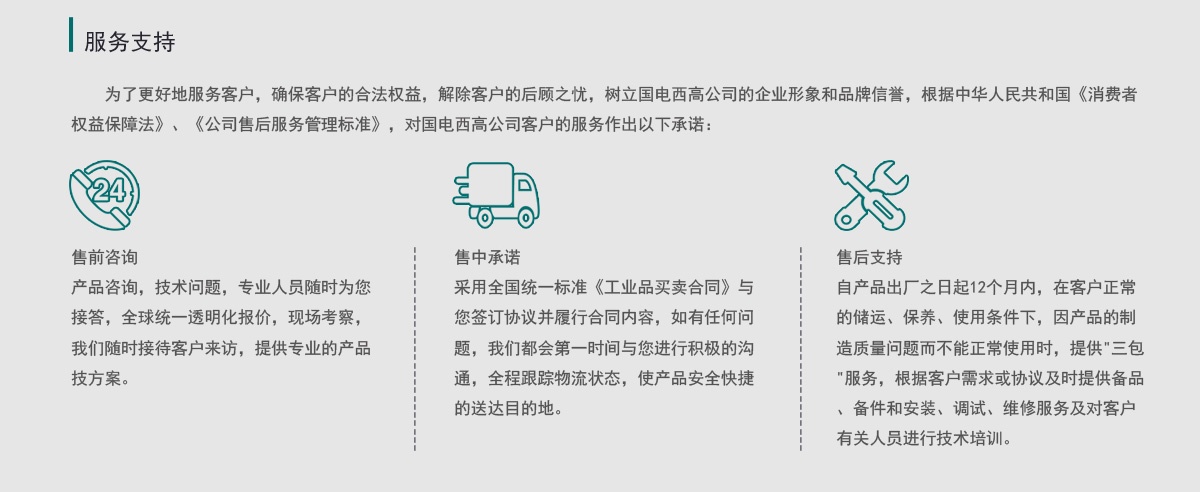 自產品出廠之日起12個月內,在客戶正常 的儲運、保養、使用條件下,因產品的制 造質量問題而不能正常使用時,提供"三包 "服務,根據客戶需求或協議及時提供備品 、備件和安裝、調試、維修服務及對客戶 有關人員進行技術培訓。