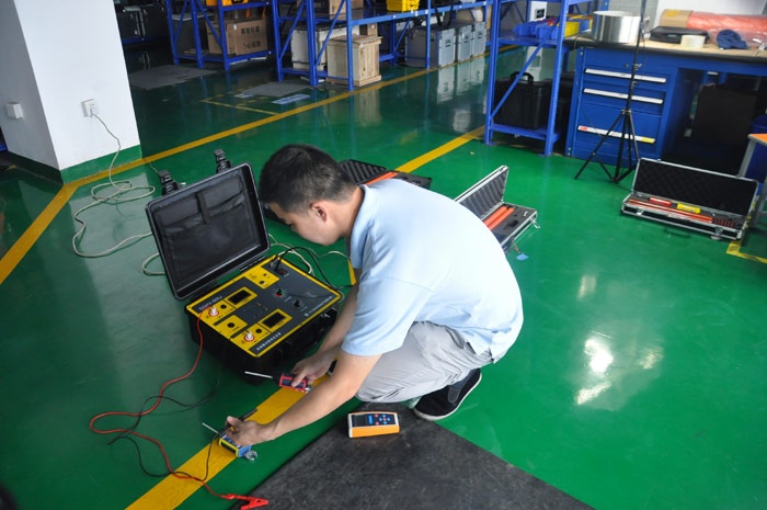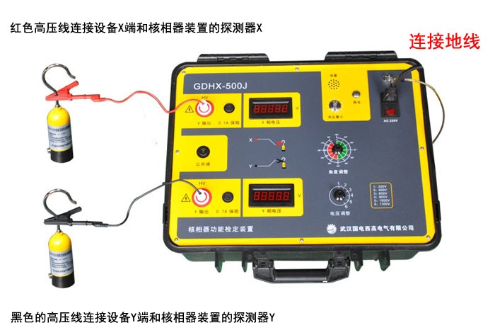 首先我們將紅色高壓線連接設備X端和核相器裝置的探測器X,黑色的高壓線Y端連接核相器裝置的探測器Y,最后連接設備的電源線,連接好的核相器X,Y整齊放在絕緣地板上,我們會搭配核相器組合使用的接受主機來測試,