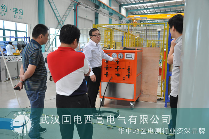 隨后客戶前往我司廠房對現有的SF6試驗設備樣品進行詳細的了解考察。由我司的技術人員詳細講解了SF6氣體回收裝置的試驗原理、操作以及技術參數等。