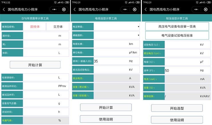 目前已上線的功能有串聯諧振、沖擊電壓電容、SF6年泄漏率、電纜選型、耐壓選型、電阻率等系列相關計算。其中包括已知能量電壓計算電容,已知電容電壓計算能量等,還可以幫助選擇耐壓設備、電纜,輸入相關參數則可計算出適合的型號設備。只需在空白位置輸入已知的數據,點擊計算即可得出相應的數據結果。