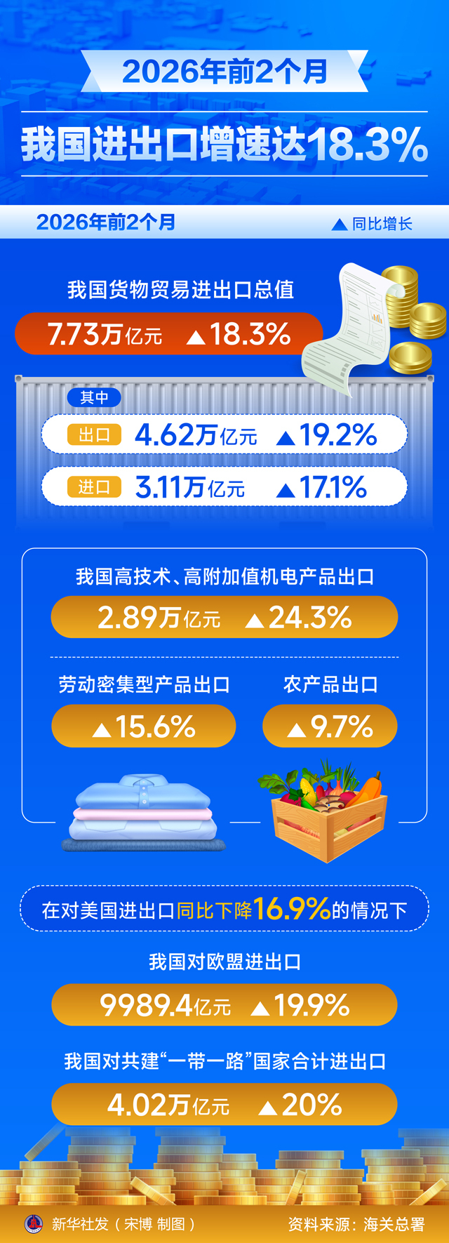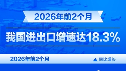 海關總署3月10日發布數據顯示,2026年前2個月,我國貨物貿易進出口總值7.73萬億元,同比增長18.3%。其中,出口4.62萬億元,增長19.2%;進口3.11萬億元,增長17.1%。