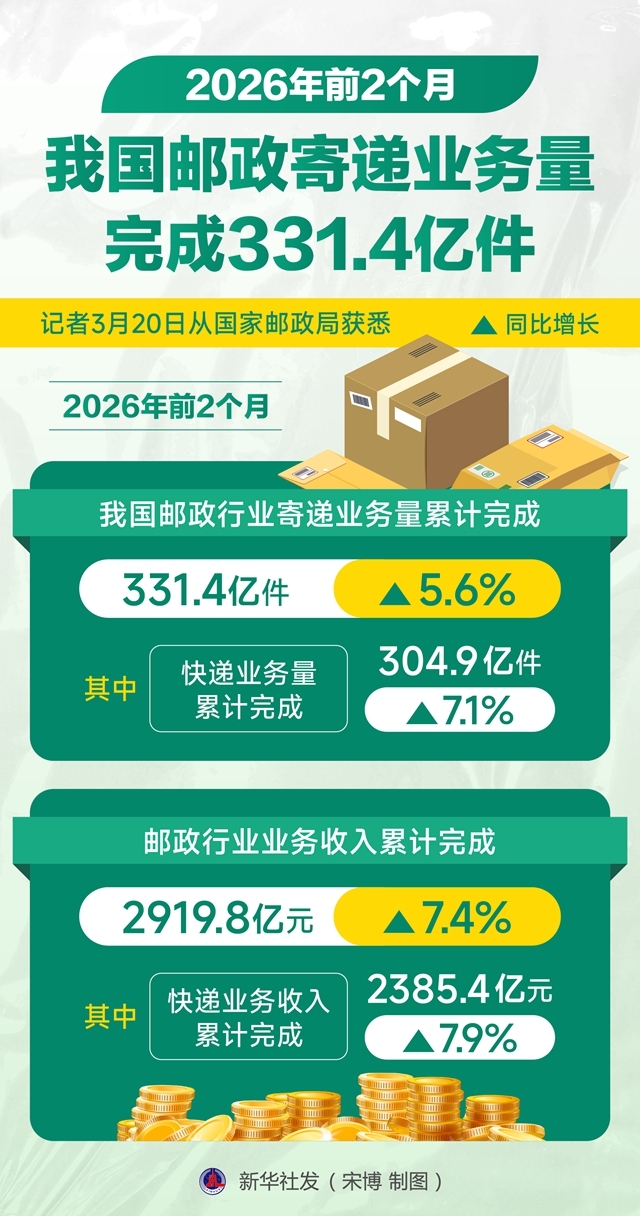 記者3月20日從國家郵政局獲悉,今年前2個月,我國郵政行業寄遞業務量累計完成331.4億件,同比增長5.6%。其中,快遞業務量累計完成304.9億件,同比增長7.1%。